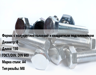Болт с полукруглой головкой и квадратным подголовником 8х130 DIN 603 Сталь: А4 М8, цену уточнять, кг цена от 15.3 ₽ / кг, где купить, условия доставки в Сургуте и Тюменской области