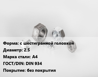Гайка с шестигранной головкой D=2.5 Сталь: А4 DIN 934 без покрытия, шт цена По запросу где купить, условия доставки в Сургуте и Тюменской области