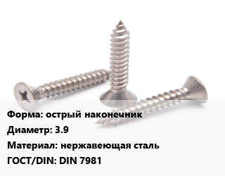 Саморез острый наконечник D=3.9 нержавеющая сталь ГОСТ: DIN 7981