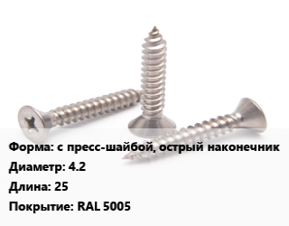 Саморез с пресс-шайбой, острый наконечник D=4.2 L=25 RAL 5005, упаковка 1000 шт цена от 879.33 ₽ / кг, где купить, условия доставки в Сургуте и Тюменской области