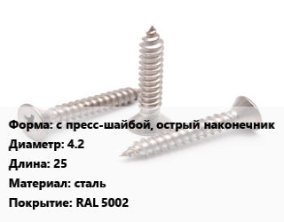 Саморез с пресс-шайбой, острый наконечник D=4.2 L=25 сталь RAL 5002, шт цена По запросу где купить, условия доставки в Сургуте и Тюменской области