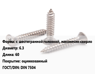 Саморез с шестигранной головкой, наконечик-сверло D=6.3 L=60 оцинкованный ГОСТ: DIN 7504, шт цена от 8.03 ₽ / кг, где купить, условия доставки в Сургуте и Тюменской области