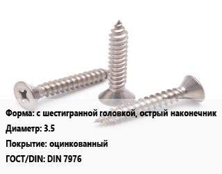 Саморез с шестигранной головкой, острый наконечник D=3.5 оцинкованный ГОСТ: DIN 7976, шт цена По запросу где купить, условия доставки в Сургуте и Тюменской области