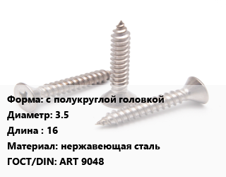 Саморез с полукруглой головкой D=3.5 L=16 нержавеющая сталь ГОСТ: ART 9048, упаковка 15000 шт цена от 6 478 ₽ / кг, где купить, условия доставки в Сургуте и Тюменской области