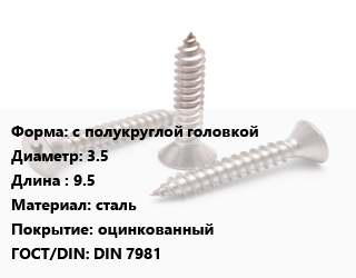 Саморез с полукруглой головкой D=3.5 L=9.5 сталь оцинкованный ГОСТ: DIN 7981