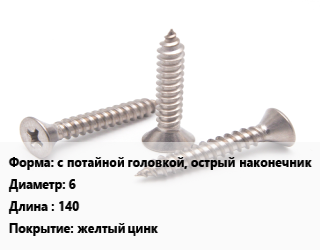 Саморез с потайной головкой, острый наконечник D=6 L=140 желтый цинк, шт цена от 23.81 ₽ / кг, где купить, условия доставки в Сургуте и Тюменской области