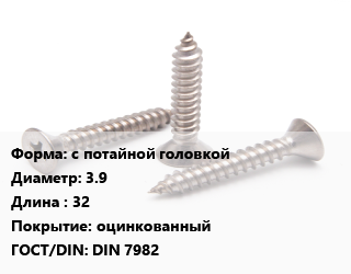 Саморез с потайной головкой D=3.9 L=32 оцинкованный ГОСТ: DIN 7982