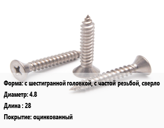 Саморез с шестигранной головкой, с частой резьбой, сверло D=4.8 L=28 оцинкованный