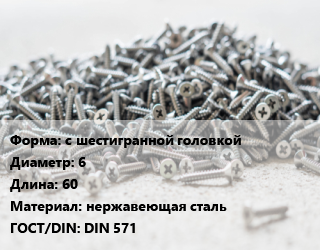Шуруп с шестигранной головкой 6х60 нержавеющая сталь ГОСТ: DIN 571, шт цена от 17.54 ₽ / кг, где купить, условия доставки в Сургуте и Тюменской области