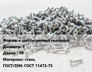 Шуруп с шестигранной головкой 3х10 сталь ГОСТ: ГОСТ 11473-75, шт цена от 43.65 ₽ / кг, где купить, условия доставки в Сургуте и Тюменской области