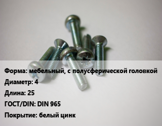 Винт мебельный, с полусферической головкой 4х25 DIN 965 белый цинк