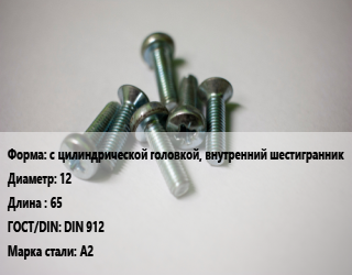 Винт с цилиндрической головкой, внутренний шестигранник 12х65 DIN 912 Сталь: A2, по запросу, кг цена от 29.79 ₽ / кг, где купить, условия доставки в Сургуте и Тюменской области
