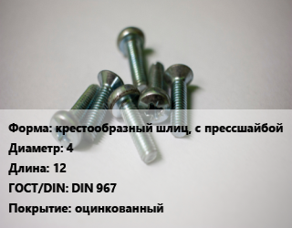 Винт крестообразный шлиц, с прессшайбой 4х12 DIN 967 оцинкованный