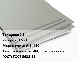 Лист нержавеющий 0.8 1.5х3 Сталь: AISI 430 Тип:4N, шлифованный ГОСТ 5632-83