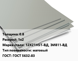 Лист нержавеющий 0.8 1х2 Сталь: 12Х21Н5Т-ВД, ЭИ811-ВД Тип:матовый ГОСТ 5632-83, х/к цена от 380 369 ₽ / т, где купить, условия доставки в Сургуте и Тюменской области