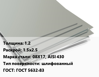 Лист нержавеющий 1.2 1.5х2.5 Сталь: 08Х17, AISI 430 Тип:шлифованный ГОСТ 5632-83, х/к, в пленке цена от 145 805 ₽ / т, где купить, условия доставки в Сургуте и Тюменской области