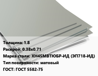 Лист нержавеющий 1.8 0.38х0.71 Сталь: ХН45МВТЮБР-ИД (ЭП718-ИД) Тип:матовый ГОСТ 5582-75