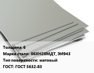Лист нержавеющий 6 Сталь: 06ХН28МДТ, ЭИ943 Тип:матовый ГОСТ 5632-83
